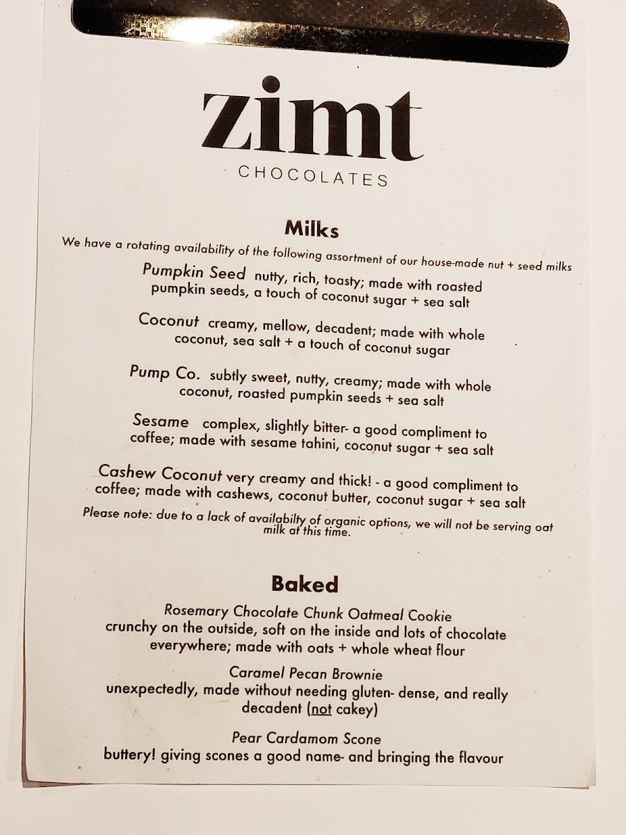 The menu at Zimt Chocolates features a tempting selection of drinks and baked treats that cater to every palate. Begin your experience with their signature PB Mocha or Matcha Latte, each expertly crafted with homemade plant-based milks, elevating every sip to an unforgettable level. For those who prefer a classic brew, the Americano Coffee and Tea options are also available, embodying a balance of taste and comfort.
